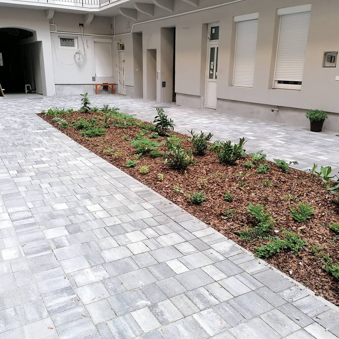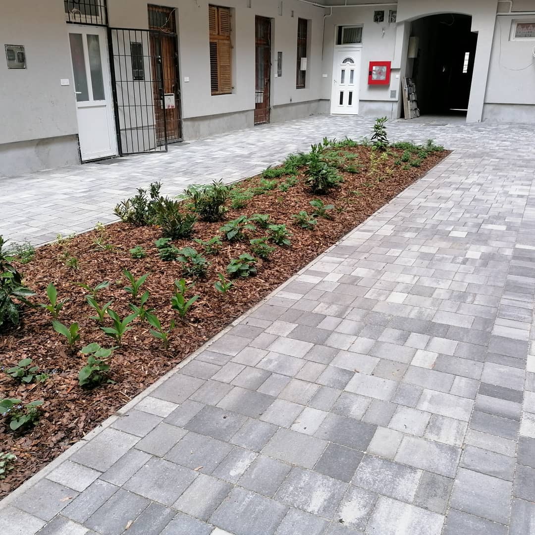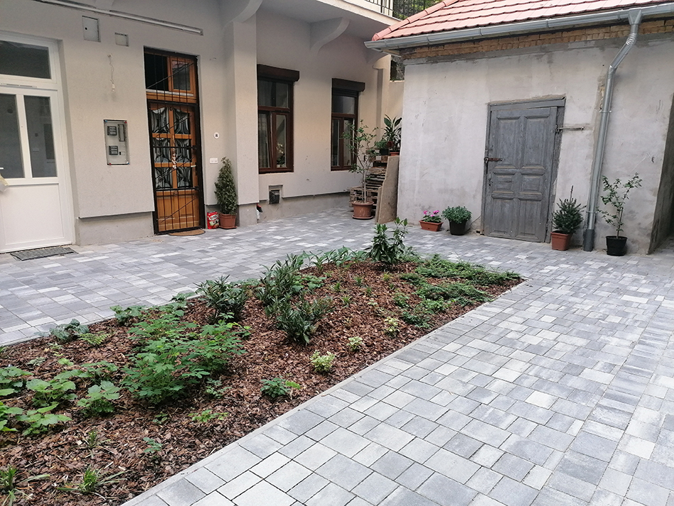 A házat felújító vállalkozó felkérése után egy egyszerű, funkcionalista tervezést követően fogtunk hozzá a kivitelezésnek. A lehető legnagyobb növényfelület létrehozása közben ügyeltünk arra, hogy földszinti ingatlanok továbbra is kényelmesen és akadálymentesen megközelíthetőek legyenek. A burkolat lejtéseit természetesen a növényágyás felé alakítottuk ki, míg a letisztult rakásmód egészen az utcai kapuig folytatódott.