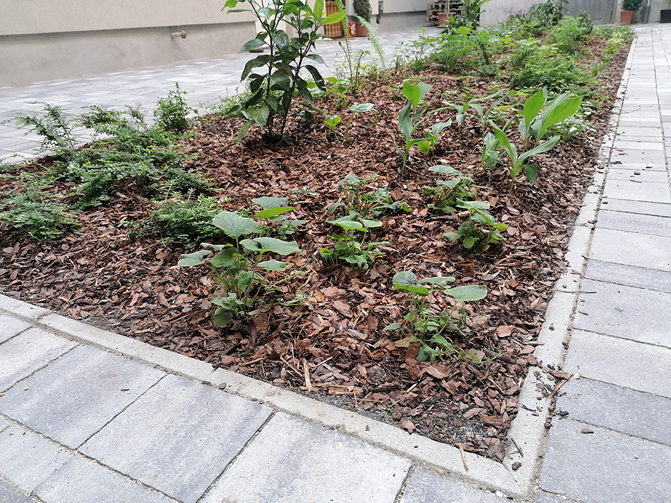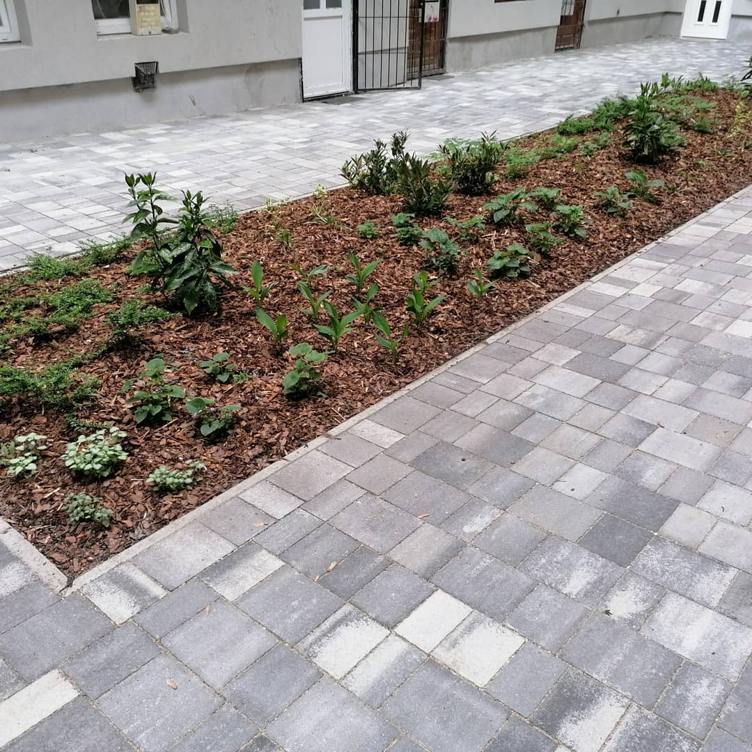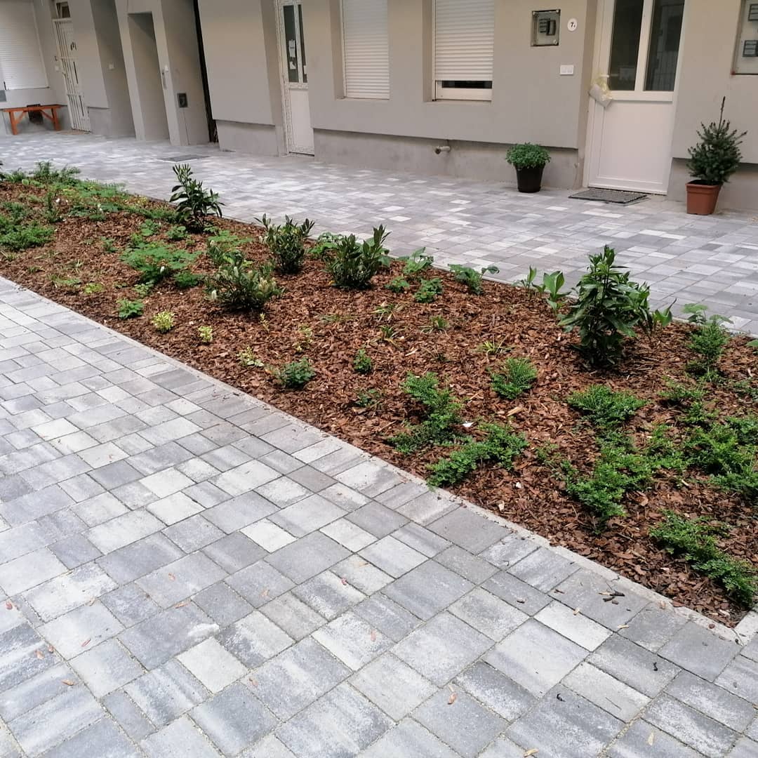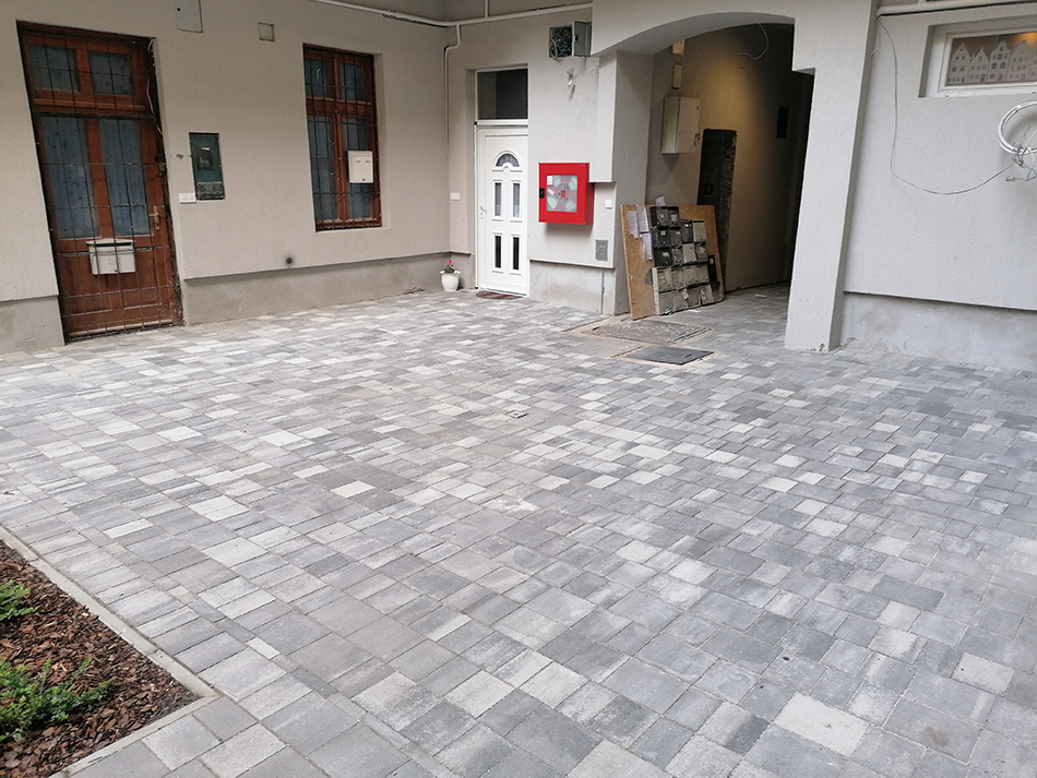A házat felújító vállalkozó felkérése után egy egyszerű, funkcionalista tervezést követően fogtunk hozzá a kivitelezésnek. A lehető legnagyobb növényfelület létrehozása közben ügyeltünk arra, hogy földszinti ingatlanok továbbra is kényelmesen és akadálymentesen megközelíthetőek legyenek. A burkolat lejtéseit természetesen a növényágyás felé alakítottuk ki, míg a letisztult rakásmód egészen az utcai kapuig folytatódott.